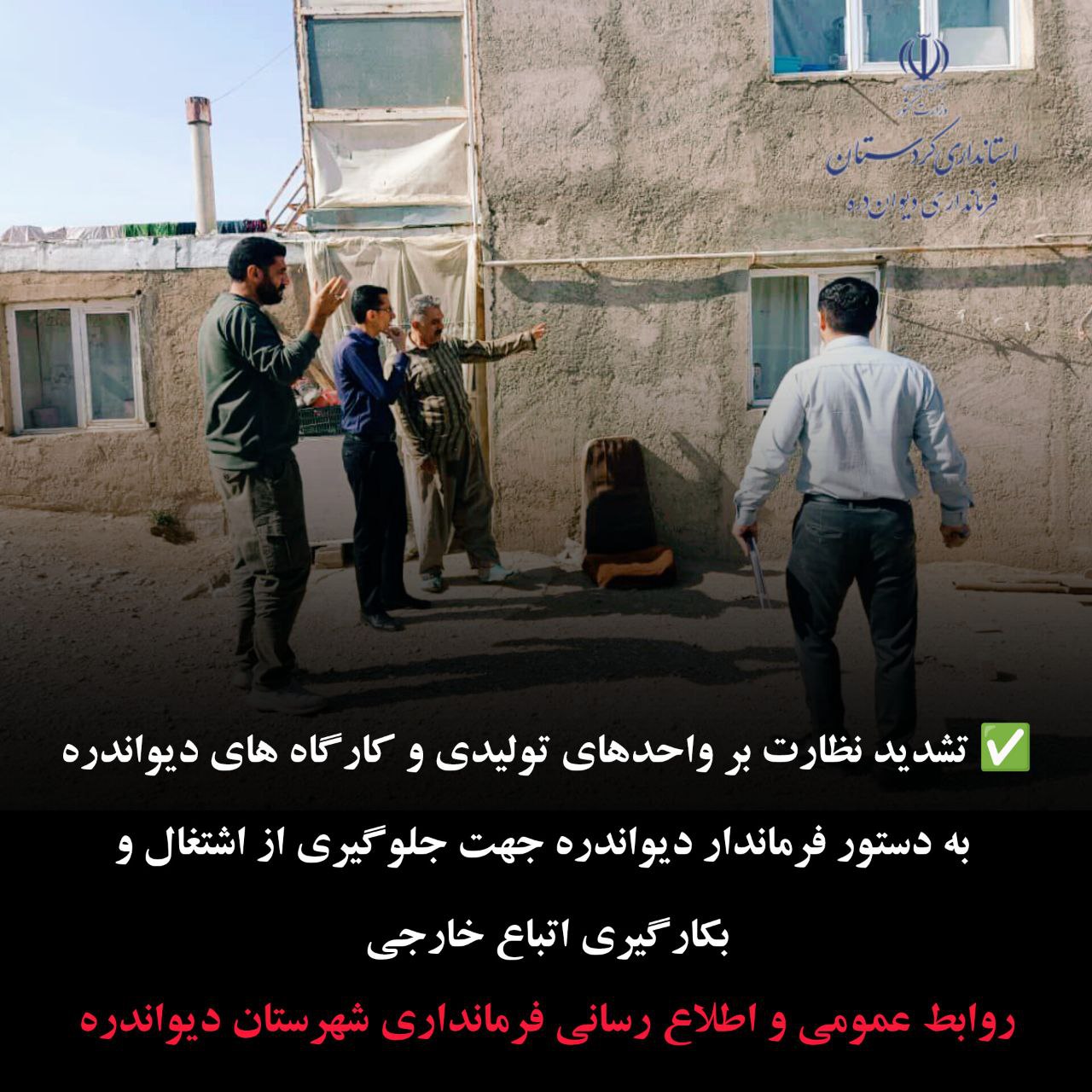 ✅ تشدید نظارت بر واحدهای تولیدی و کارگاه های دیواندره به دستور فرماندار دیواندره جهت جلوگیری از اشتغال و بکارگیری اتباع خارجی