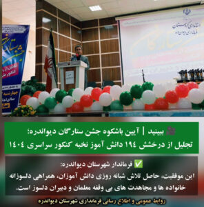 ۱۴۰۴/۸/۸آیین باشکوه جشن ستارگان دیواندره؛ تجلیل از درخشش 194 دانش آموز نخبه کنکور سراسری 1404